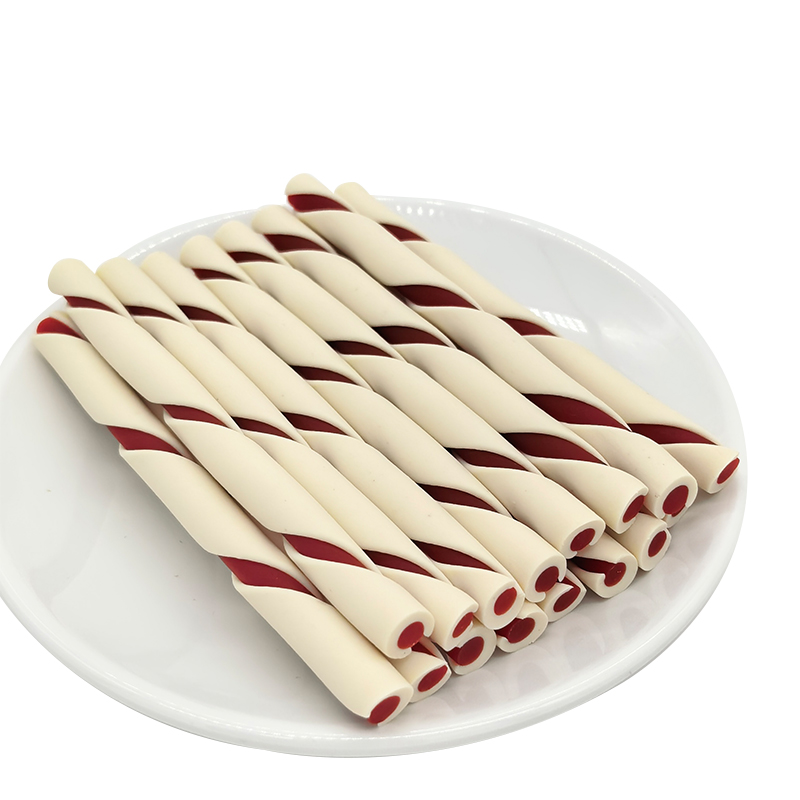 Multi-flavored, two-tone twisted dog treats/chew sticks for stress relief and teeth cleaning.