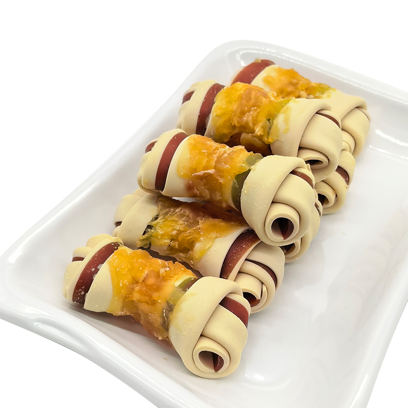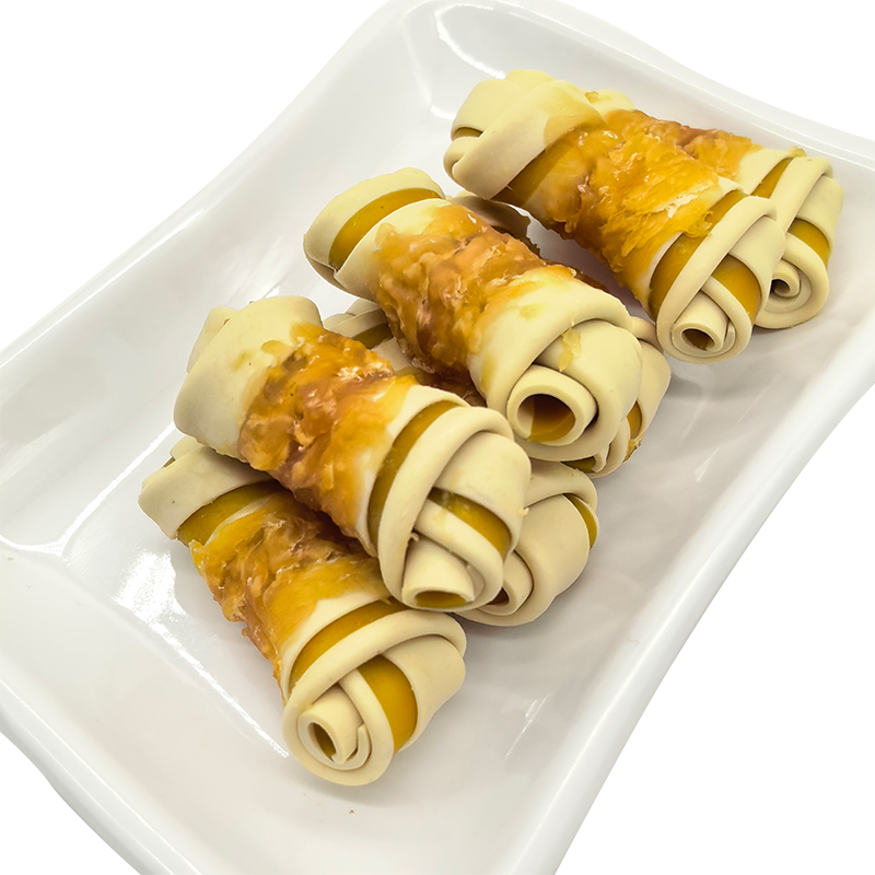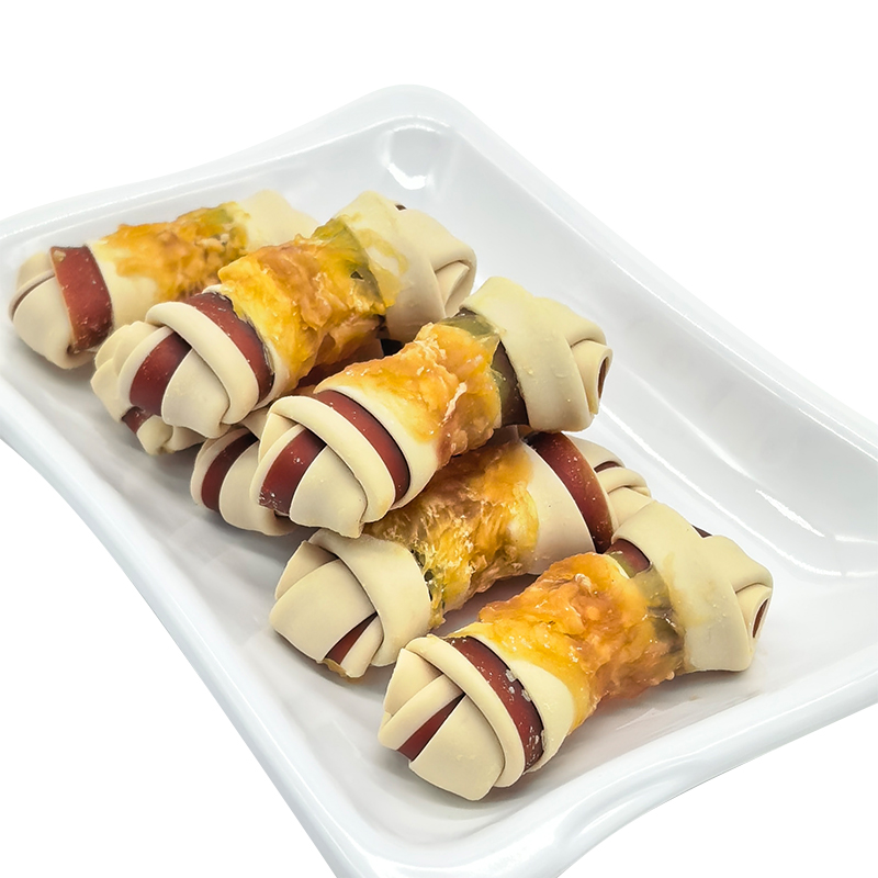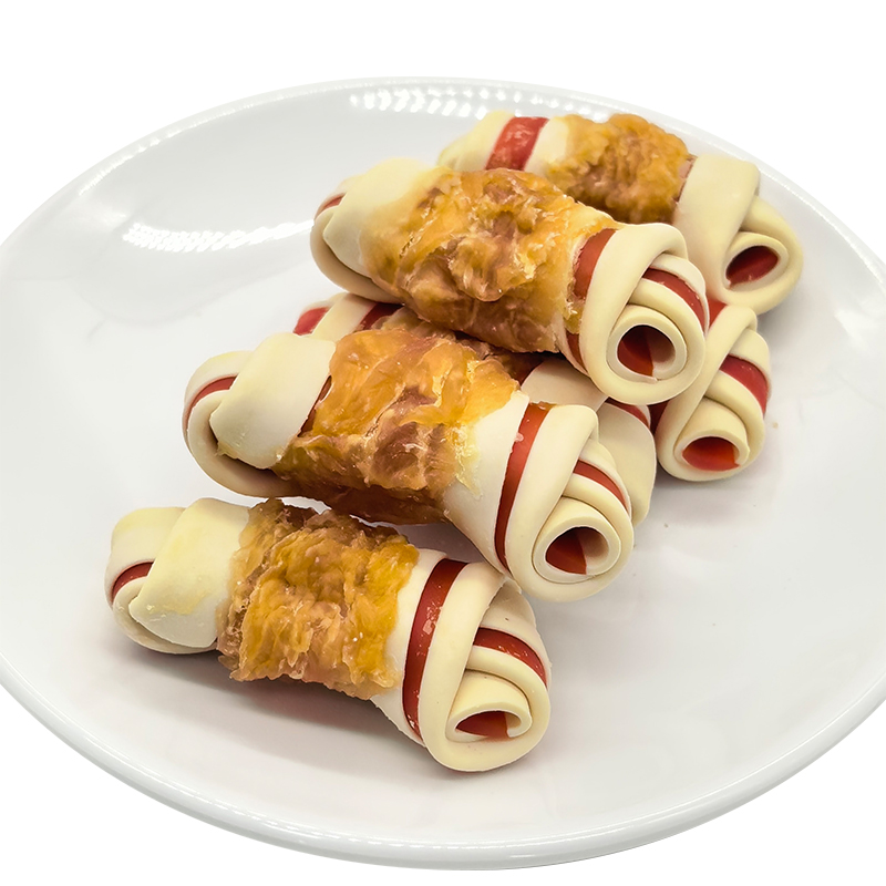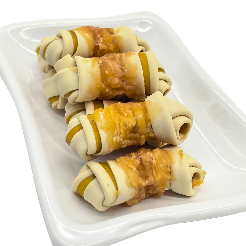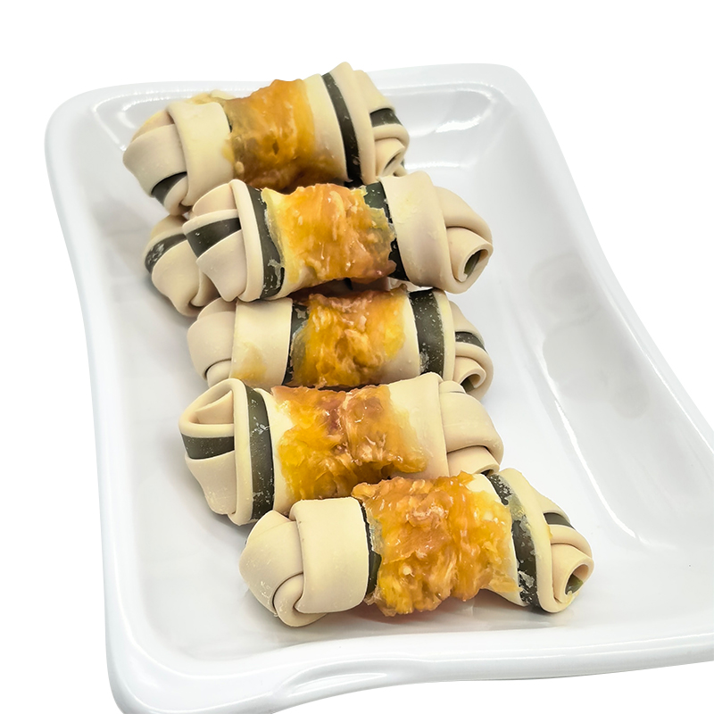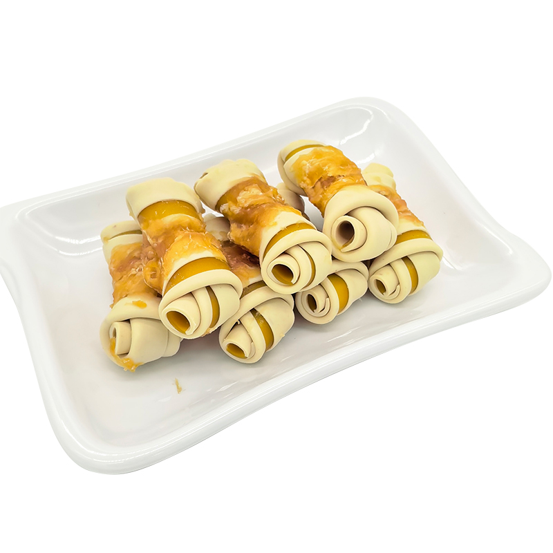 The KN003 organic protein dog chew treats are crafted with a wholesome blend of corn starch, sweet potato powder, protein powder, chicken breast, vegetable powder, glycerin, sorbitol, and animal oil. Each chew is carefully wrapped with real chicken, offering a nutritious and flavorful reward for dogs. Available in three delicious flavors—milk, mint, and chicken—these treats not only satisfy chewing instincts but also support daily oral care by cleaning teeth, reducing tartar, and freshening breath. Enriched with balanced nutrients, they help maintain a shiny coat and promote healthy digestion, making them an ideal choice for both health and enjoyment.