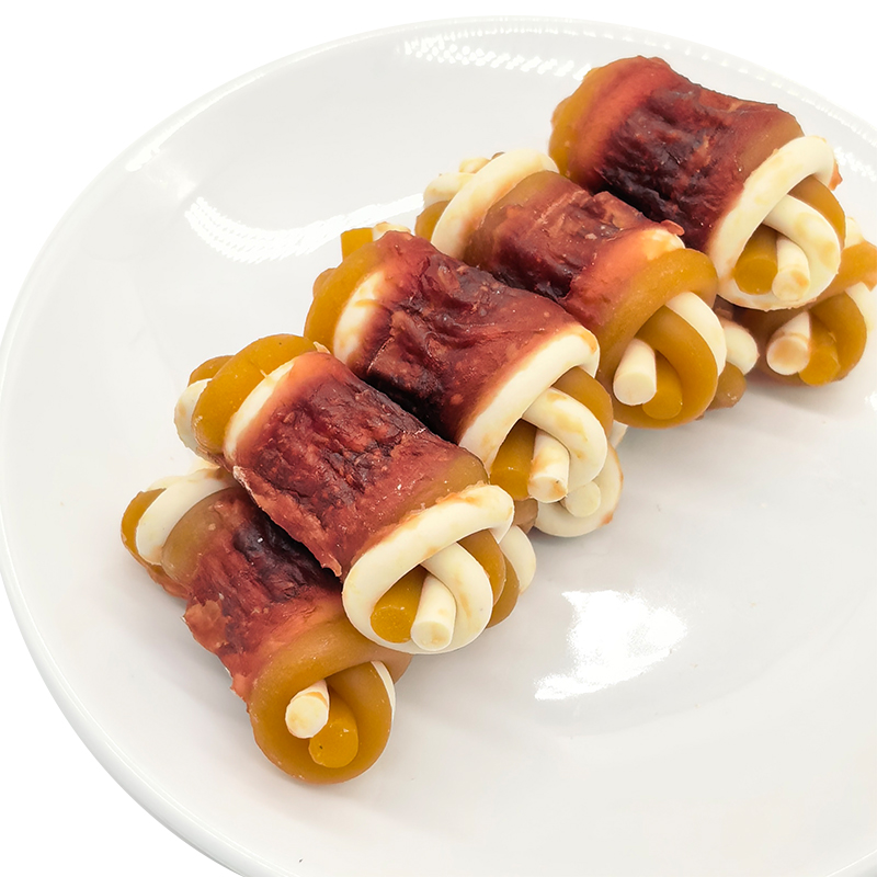 Tender duck meat wrapped around a bone; a pet teething stick, a treat for calcium supplementation and healthy fur.